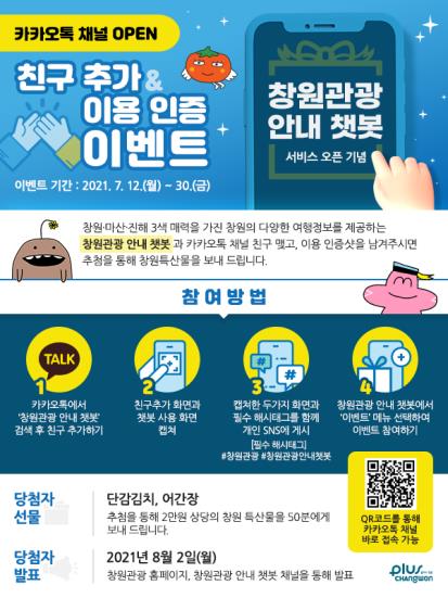 '창원관광 안내 챗봇'을 친구 추가하고 이용 화면을 캡처해 개인 SNS에 해시태그(#창원관광·#창원관광안내챗봇)를 포함해 올리면 추첨을 통해 50명에게 2만원 상당의 창원 특산물(단감김치·어간장)을 준다.