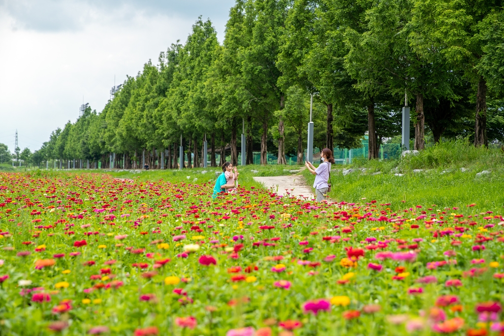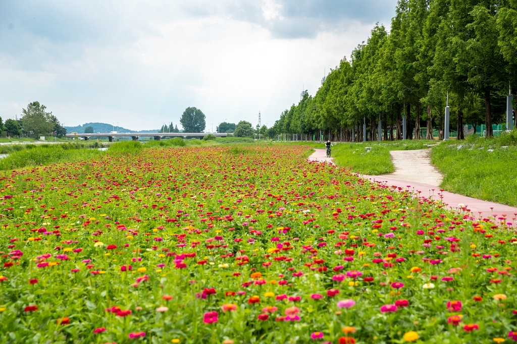 (증평=연합뉴스) 충북 증평 주민들의 휴식공간인 보강천변에 백일홍이 만개, 형형색색의 꽃물결을 이루고 있다.
