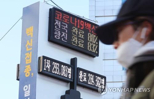 | ▲ A pedestrian walks by an electric board in Seoul on Dec. 1, 2021, saying that 80 percent of the country's population has been fully vaccinated. (Yonhap) |