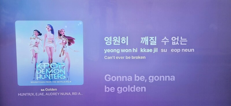 넷플릭스 영화 '케이팝 데몬 헌터스'의 인기 오리지널사운드트랙(OST) '골든'(Golden)을 애플 뮤직으로 재생하자, 한국어 가사 '영원히 깨질 수 없는'을 영어로 음차한 'young won hi kkae jil su eup neun'이라는 문구가 등장했다.