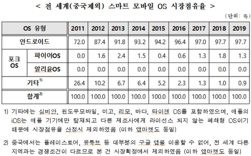 이에 구글은 모바일 OS 분야 점유율을 97.7%까지 끌어올리며 독점 사업자 지위를 공고히 했다.