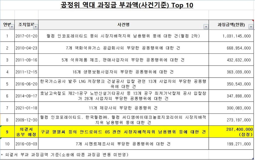 최종 확정되는 과징금은 공정위가 2016년 퀄컴에 부과한 1조311억원에 이어 시장지배력 남용 및 불공정행위 사건 중 두 번째로 큰 금액이 될 전망이다. 입찰담합을 포함한 전체 사건으로 보면 역대 9번째로 많은 금액이다.