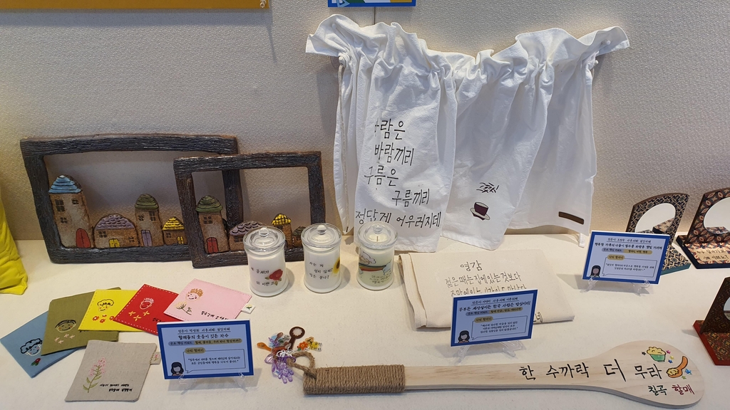 (칠곡=연합뉴스) 홍창진 기자 = 경북 칠곡군은 한글날을 앞두고 6일 군청 갤러리에서 '칠곡할매글꼴'을 활용해 만든 상품 전시회를 열었다.