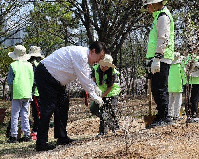 President Yoon Suk Yeol plants a tree at a park in Busan on April 5, 2024, the country's Arbor Day. (Pool photo) (Yonhap)
