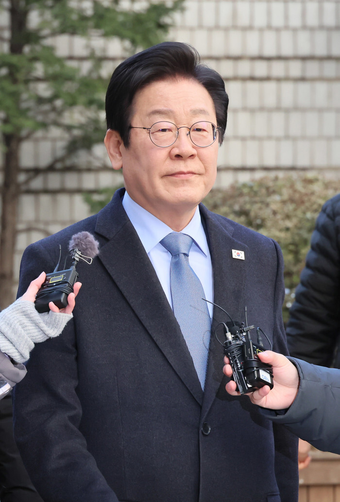 Lee Jae-myung, leader of the main opposition Democratic Party, appears at the Seoul High Court in the capital on Jan. 23, 2025, to attend the first hearing for his appeals trial over allegations that he made false statements during the 2022 presidential campaign as the party's candidate. (Yonhap)