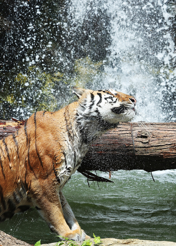 A Korean tiger cools itself in the water amid a heat wave alert at Everland in Yongin, 42 km south of Seoul, on June 19, 2024. (Yonhap)