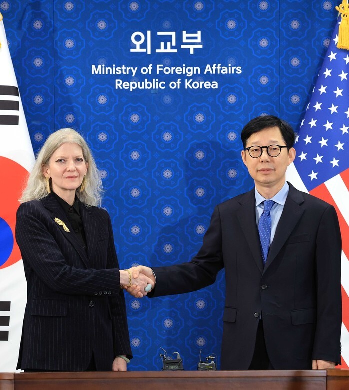 South Korean Vice Foreign Minister Park Yoon-joo (R) shakes hands with his U.S. counterpart, Allison Hooker, at the foreign ministry in Seoul on Oct. 10, 2025, as they meet to discuss the bilateral alliance and coordination over North Korea's nuclear issues, ahead of the upcoming Asia-Pacific Economic Cooperation summit. (Pool photo) (Yonhap)