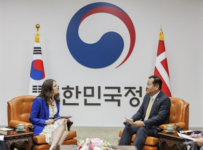 South Korean Interior Minister Lee Sang-min (R) talks with Marie Bjerre, Denmark's digital government and gender equality minister, at the government complex in Seoul on April 25, 2024. (Yonhap)