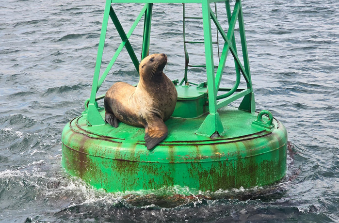 A sea lion is spotted on a buoy off Ulsan, some 300 kilometers southeast of Seoul, on Aug. 13, 2024, in this photo provided by the Korea Coast Guard. (PHOTO NOT FOR SALE) (Yonhap)