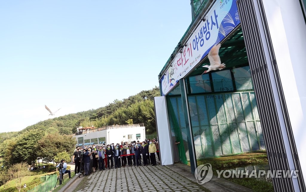 "하나둘 셋" 카운트다운과 함께 사육사가 방사장 문을 열자 따오기 10마리가 일제히 우리 밖으로 날개를 펄럭이며 힘차게 날아올랐다.