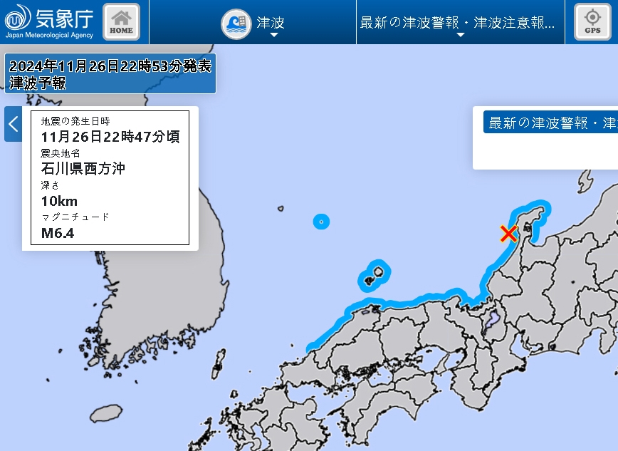 일본 기상청은 지난 26일 오후 10시47분 이시카와현 노토반도 서쪽 바다에서 규모 6.4의 강진이 발생했다고 발표했다.
