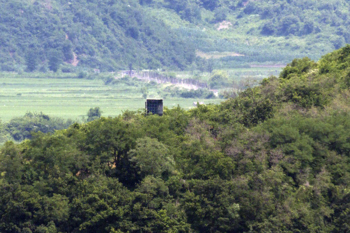 This image taken from an observation tower from the South Korean border town of Paju, 37 kilometers northwest of Seoul, on June 25, 2024, shows a facility believed to be an anti-South Korea propaganda loudspeaker set up along the Imjin River in the North Korean border county of Kaepung, North Hwanghae Province. (Yonhap)