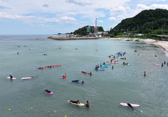 People surf in the sea off Yangyang, 155 kilometers east of Seoul, amid a heat wave on July 29, 2024. (Yonhap)