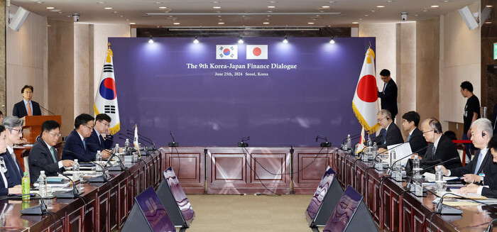 South Korea's Finance Minister Choi Sang-mok (4th from L), who doubles as the deputy prime minister for economic affairs, speaks during a meeting with his Japanese counterpart, Shunichi Suzuki (4th from R), at the government complex in Seoul on June 25, 2024. (Yonhap)