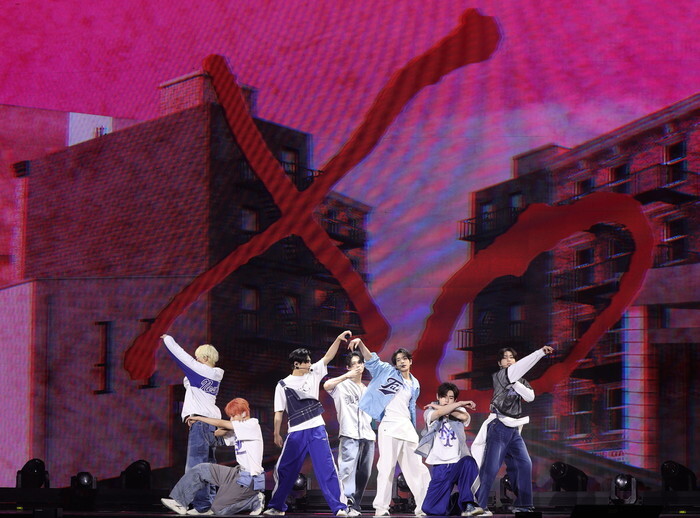South Korean boy group Enhypen performs during a showcase to promote the group's second album "Romance: Untold" in Seoul on July 11, 2024. (Yonhap)