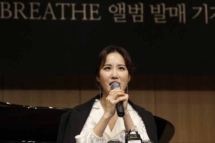 South Korean soprano Park Hye-sang responds to reporters' questions during a publicity event in Seoul on Feb. 5, 2024 to promote her Deutsche Grammophon second album "Breathe". (Yonhap)