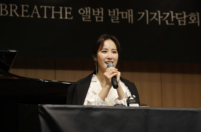 South Korean soprano Park Hye-sang responds to reporters' questions during a publicity event in Seoul on Feb. 5, 2024 to promote her Deutsche Grammophon second album "Breathe". (Yonhap)