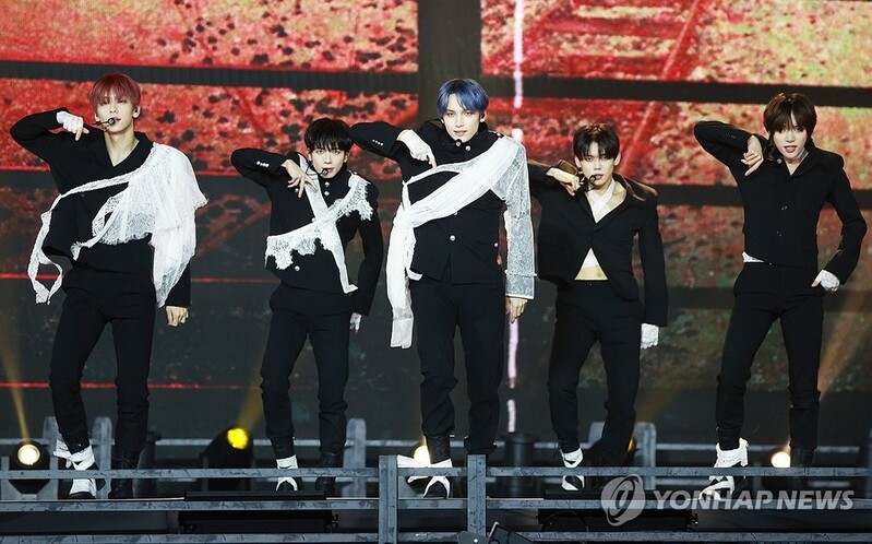▲ '독보적인 컨셉돌' 투모로우바이투게더 (서울=연합뉴스) 진연수 기자 = 그룹 투모로우바이투게더(TXT)가 1일 오후 서울 성북구 고려대학교 화정체육관에서 열린 여섯 번째 미니앨범 '미니소드 3: 투모로우(minisode 3: TOMORROW)' 발매 쇼케이스에서 타이틀 곡 무대를 선보이고 있다. 2024.4.1 jin90@yna.co.kr |