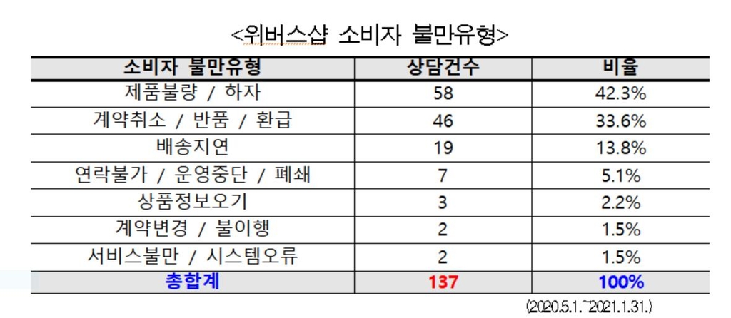 서울시 전자상거래센터에 따르면 지난해 5월부터 지난달 말까지 위버스샵 관련 소비자 불만이 137건 접수됐다. 유형은 ▲ 제품 불량 및 결함(41.7%) ▲ 반품 및 환불(34.1%) ▲ 배송 지연(13.6%) 등이었다.