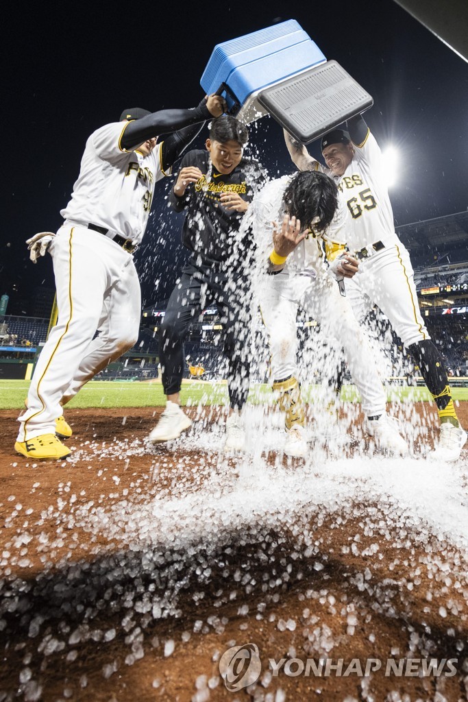 | ▲ 배지환에게 얼음을 쏟는 최지만 (피츠버그 USA투데이스포츠/로이터=연합뉴스) 피츠버그 최지만(왼쪽)이 12일(한국시간) 미국 펜실베이니아주 피츠버그 PNC파크에서 열린 메이저리그 휴스턴 애스트로스와의 홈 경기, 9회말 끝내기 3점 홈런을 친 배지환에게 얼음을 쏟으며 축하하고 있다. |