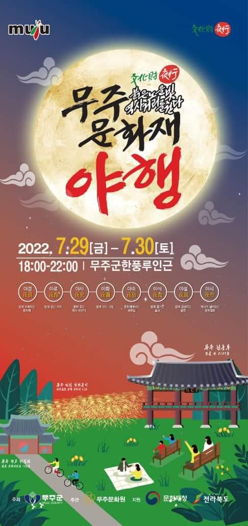문화재 야행'은 국가 문화재 '보물'로 지정된 한풍루와 무주향교, 남대천 등의 야경을 감상하고 다양한 문화·공연을 즐기는 행사다.