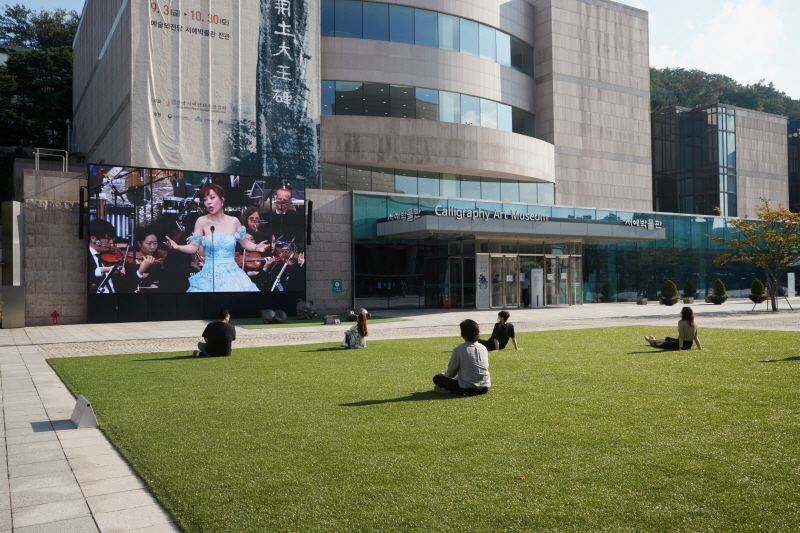▲ 예술의전당 내 서에박물관 앞 음악광장에 설치된 가로 9m, 세로 5m 크기의 대형 스크린이 '광장시네마'란 이름으로 상시 운영된다. 오전 9시부터 오후 6시까지 예술의전당 기획공연 실황, 독립 단편 영화, 예술의전당의 '영상화 사업(SAC on Screen)' 관련 영상, 기획 프로그램 홍보 영상 등이 상영된다. (서울=연합뉴스)