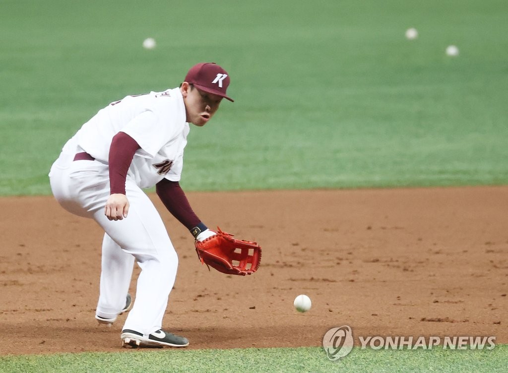 | ▲ Kiwoom Heroes' infielder Kim Woong-bin fields a grounder during practice at Gocheok Sky Dome in Seoul on Feb. 14, 2021. (Yonhap) |