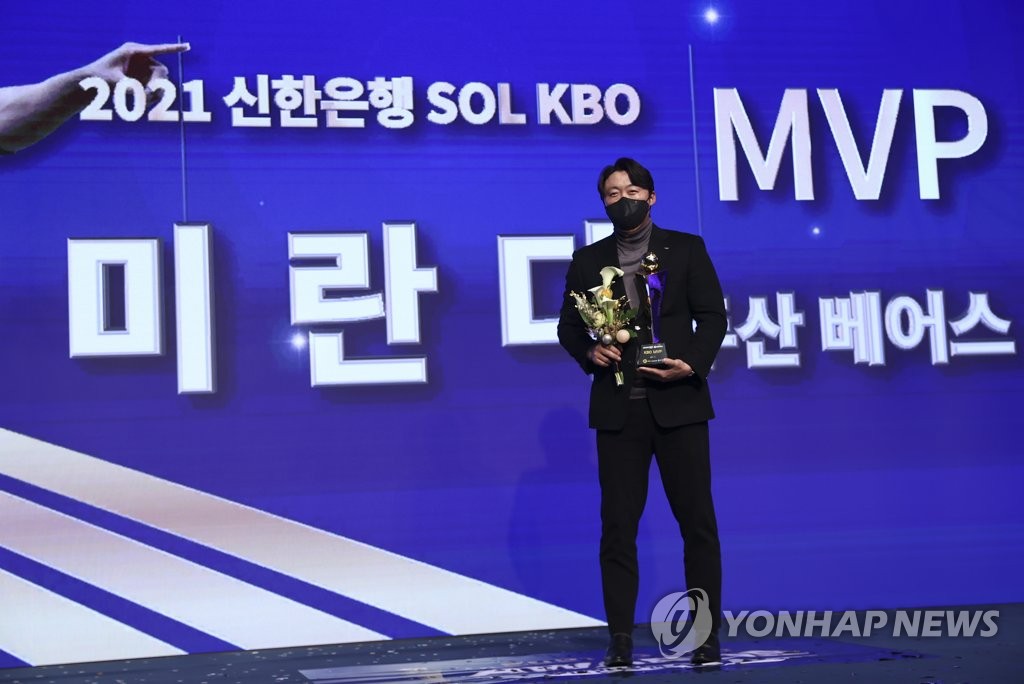 Miranda, who has pitched in the majors, Japan and Taiwan, is the third straight foreign player to be named KBO's MVP, following Mel Rojas Jr. of the KT Wiz in 2020 and Josh Lindblom of the Bears in 2019.