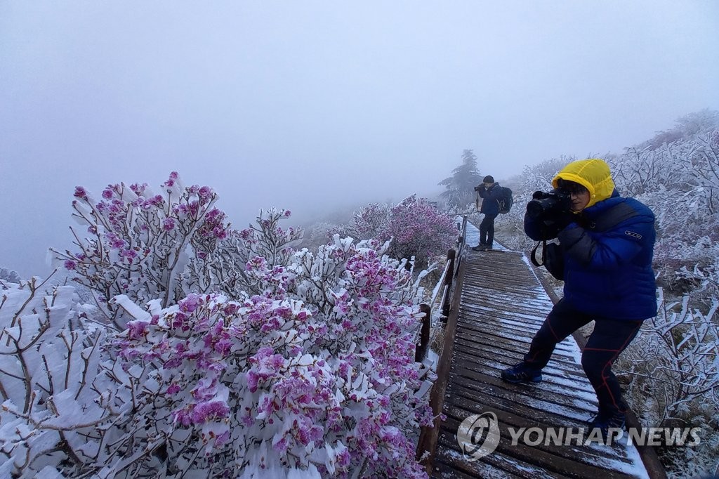 | ▲ This photo provided by Gurye County shows reporters taking pictures of the snow covered azalea flowers. (PHOTO NOT FOR SALE) (Yonhap) |