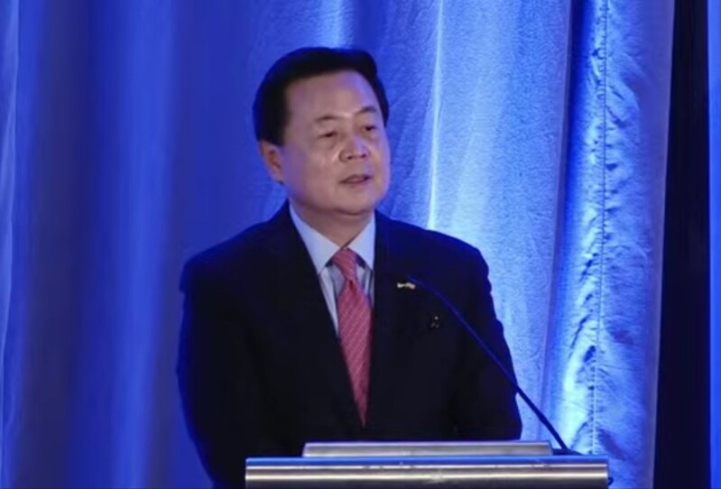 | ▲ South Korean Ambassador to the U.S. Cho Hyun-dong speaks during a forum hosted by The Korea Society in Washington on Nov. 22, 2024 in this photo captured from The Korea Society YouTube account. (PHOTO NOT FOR SALE) (Yonhap) |