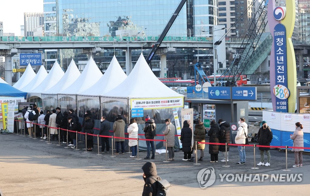 | ▲ People wait in line for coronavirus tests at a pop-up screening clinic in front of Seoul Station on Jan. 28, 2022. (Yonhap) |
