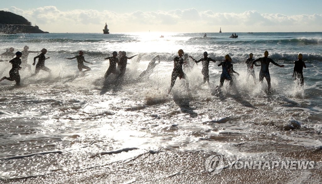 | ▲ 해운대에 모인 철인들 (부산=연합뉴스) 손형주 기자 = 23일 오전 부산 해운대구 해운대해수욕장 일대에서 열린 2021 WT 해운대 스프린트 트라이애슬론 월드컵에서 세계 각국 선수들이 힘차게 출발하고 있다. 이번 대회는 수영 750m, 사이클 20㎞, 달리기 5㎞ 스프린트 코스로 진행됐다. 2021.10.23 handbrother@yna.co.kr |