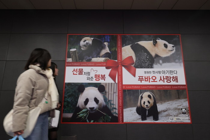 A woman walks past an ad on Fu Bao, a giant panda, at a subway station in Seoul's Mapo Ward on Feb. 15, 2024. The female panda, which was born to giant panda Ai Bao and her partner, Le Bao, at the Everland amusement park in Yongin, south of Seoul, in 2020, will be returned to China in April under an international agreement. (Yonhap)