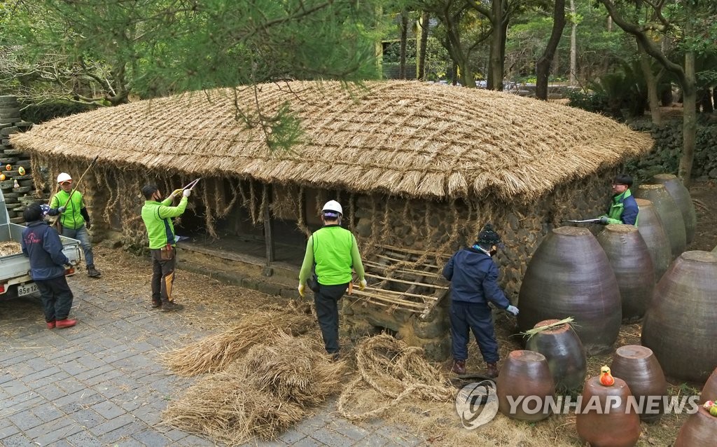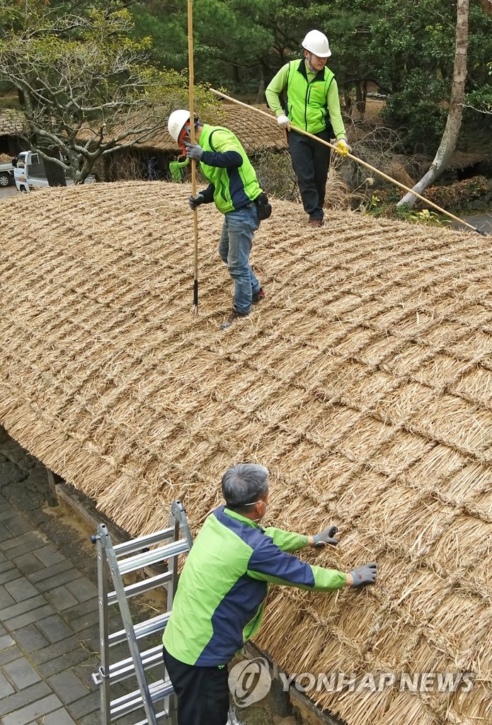 (제주=연합뉴스) 절기상 입춘이 이틀 지난 5일 오후 제주시 한림읍 한림공원 내 재암민속촌에서 공원 직원들이 '새(띠)'를 사용해 초가지붕을 잇고 있다.