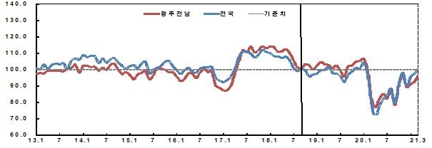| ▲ 광주전남 소비자 심리지수 그래픽 [한국은행 광주전남본부 제공] |