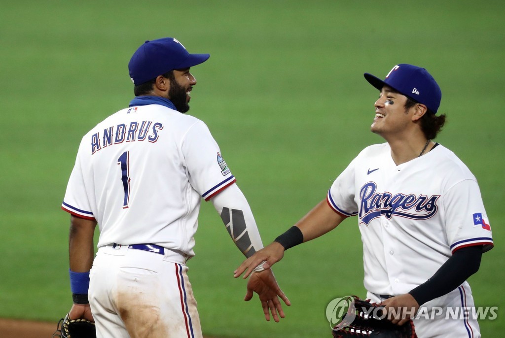 | ▲ In this Getty Images file photo from July 29, 2020, Choo Shin-soo of the Texas Rangers (R) celebrates a 7-4 win over the Arizona Diamondbacks with his teammate Elvis Andrus at Globe Life Field in Arlington, Texas. (Yonhap) |
