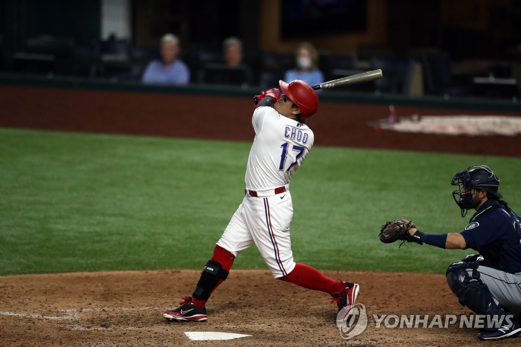 | ▲ In this Getty Images file photo from Aug. 12, 2020, Choo Shin-soo of the Texas Rangers (L) watches the flight of his sacrifice fly against the Seattle Mariners in the bottom of the eighth inning of a Major League Baseball regular season game at Globe Life Field in Arlington, Texas. (Yonhap) |