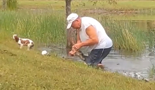 (서울=연합뉴스) 홍준석 기자 = 반려견이 악어에게 물려가자 재빠르게 연못으로 뛰어들어 구한 70대 미국 견주가 화제다.