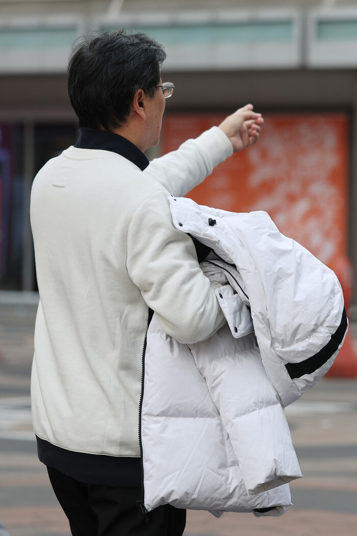 A man holding a winter coat walks on Myeongdong street in Seoul on Feb. 13, 2024, as the capital has unusually warm weather, with the mercury rising to an intraday high of 14 C. (Yonhap)