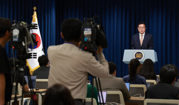 Presidential chief of staff Chung Jin-suk gives a briefing at the presidential office in Seoul on May 21, 2024, to announce that President Yoon Suk Yeol vetoed an opposition-railroaded bill to initiate a special counsel investigation into a Marine corporal's death. The corporal was swept away by a torrent in a stream during a search operation for people missing amid heavy rains in July last year. (Yonhap)