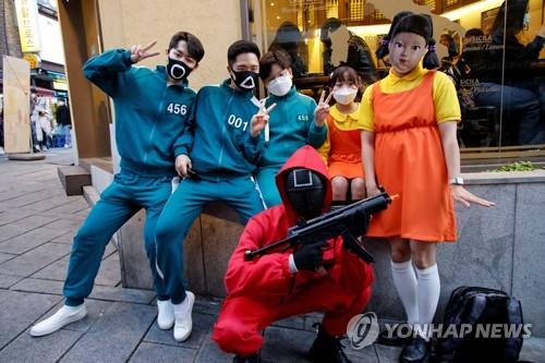 | ▲ 오징어 게임 하러 갑니다 (서울 로이터=연합뉴스) 서울 시내 거리에서 만난 오징어 게임 분장. 2021.10.30. photo@yna.co.kr |