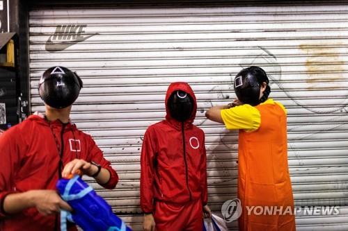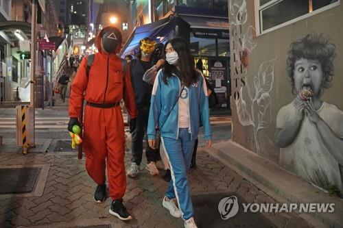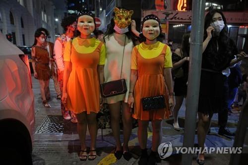 | ▲ 핼러윈 즐기러 클럽 갑니다 (홍콩 AP=연합뉴스) 30일 밤 홍콩 유흥가 란콰이펑에서 열린 핼러윈 파티에서 오징어 게임 분장이 유행했다. 2021.10.30. photo@yna.co.kr |