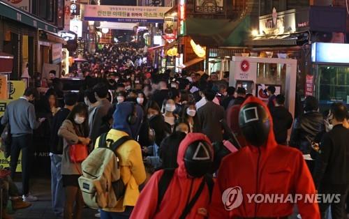 | ▲ 핼러윈 앞두고 이태원에 등장한 '오징어게임' (서울=연합뉴스) 류영석 기자 = 주말 핼러윈을 앞둔 29일 오후 인파가 몰린 서울 용산구 이태원 세계음식거리에서 넷플릭스 오리지널 시리즈 '오징어 게임'의 등장 인물 복장을 한 시민들이 기념촬영을 하고 있다. 2021.10.29 |