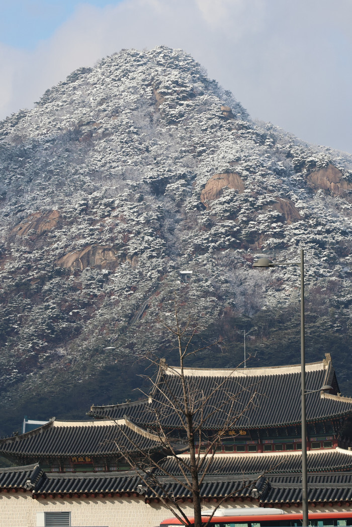 This photo, taken from Gwanghwamun Plaza in Seoul on Feb. 15, 2024, shows a snowy Mount Bukak behind Gyeongbok Palace, the main royal palace during the 1392-1910 Joseon Dynasty, following snowfall. (Yonhap)