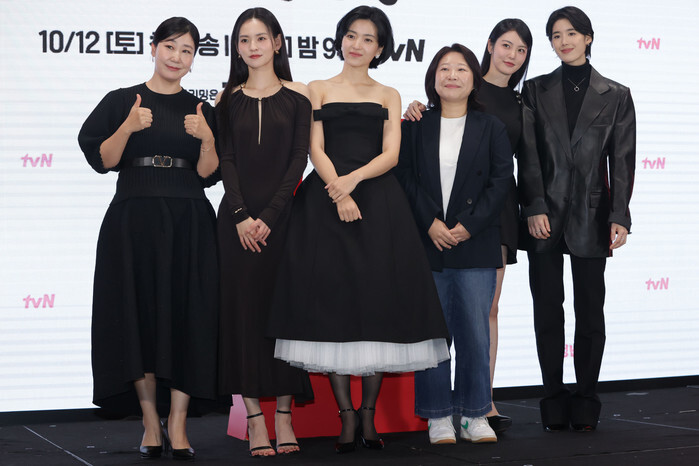 The stars of the new drama "Jeongnyeon: The Star Is Born" -- Ra Mi-ran, Kim Yoon-hye, Kim Tae-ri, Shin Ye-eun and Jung Eun-chae (L to 2nd from R) -- along with director Jung Ji-eun (3rd from R) -- pose for a photo during a publicity event in Seoul on Oct. 10, 2024. The first episode of the drama will be aired by the local cable TV network tvN on Oct. 12. (Yonhap)