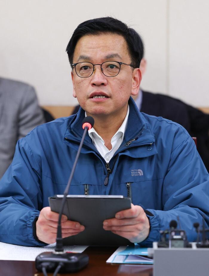 Acting President Choi Sang-mok, who concurrently serves as deputy prime minister for economic affairs and finance minister, speaks during a meeting at an outlet of the discount store chain Hanaro Mart in Seoul on Feb. 6, 2025, to check on people's livelihoods. (Pool photo) (Yonhap)