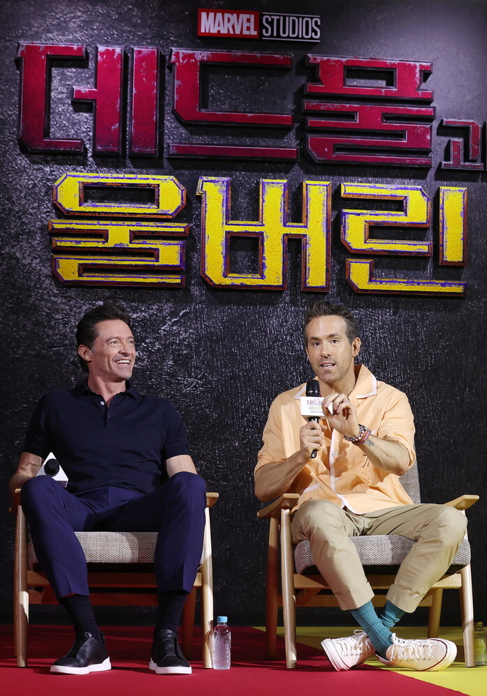 The stars of the new hollywood movie "Deadpool & Wolverine" -- Ryan Reynolds (R) and Hugh Jackman (L) -- respond to reporters' questions during a publicity event in Seoul on July 4, 2024. The movie will be released in South Korea on July 24. (Yonhap)