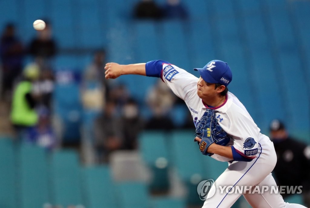 | ▲  Yang Chang-seop of the Samsung Lions pitches against the Hanwha Eagles during the top of the first inning of a Korea Baseball Organization regular season game at Daegu Samsung Lions Park in Daegu, some 300 kilometers southeast of Seoul, on April 13, 2022. (Yonhap) |