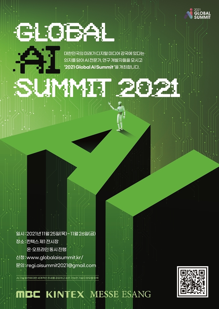 ▲ MBC, '글로벌 AI 서밋 2021' 개최 = MBC가 인공지능(AI) 기술의 현실과 환상, 미래의 가능성을 가늠하는 '글로벌 AI 서밋 2021'('Global AI Summit 2021')을 오는 25일과 26일 킨텍스 제1전시장에서 개최한다.