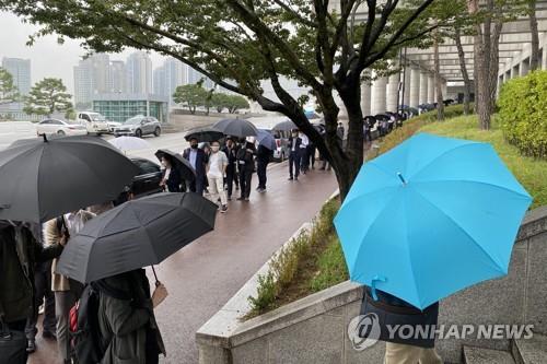 | ▲ Defense ministry officials wait in line to undergo COVID-19 tests at a makeshift testing station inside the ministry compound in central Seoul on Oct. 8, 2021, after one civilian worker tested positive for the new coronavirus earlier in the day. (Yonhap) |